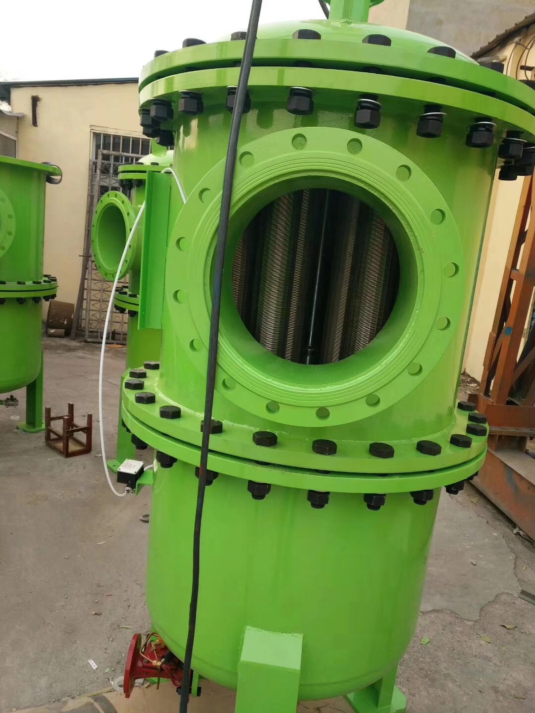 液體從進口流入,經過下固定板進入濾網,液體流向由內而外,雜質被攔截在濾芯內部,干凈流體由出口流出;隨著濾芯內雜質積累,其內外壁壓差增大。當壓差達到設定值時,壓差表發訊,過濾器開始自動反沖洗過程。減速電機通過中間軸驅動沖洗臂轉動,由定位開關控制沖洗臂的轉動角度,使之與被清洗濾網對正;排污閥開啟,使被清洗濾網外側(清潔側)與排污之間形成壓力差;在壓力差的作用下,干凈液體由外而內,對濾芯內部雜質進行反沖洗,污染物被沖掉并通過排污口排出;濾網反沖洗由時間設置,達到設定值后,減速電機會再次驅動沖洗臂轉動,對正下一組濾網進行反沖洗,以此類推,直到全部濾網清洗完成,排污閥關閉,沖洗臂在電控箱的控制下回到原始位置,反沖洗結束;整個反沖洗過程中,進水不間斷,過濾不斷流。