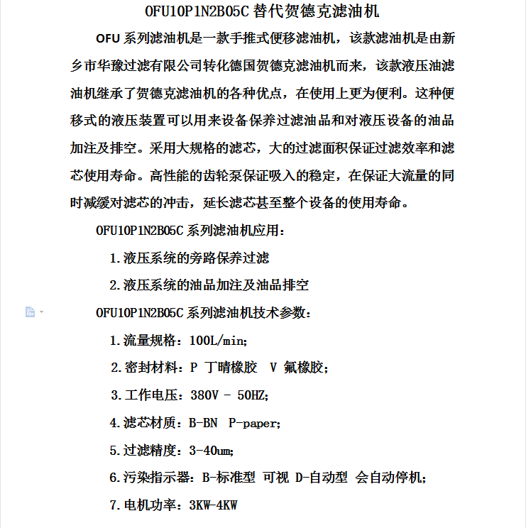 賀德克大流量濾油機OFU10P1N2B05C